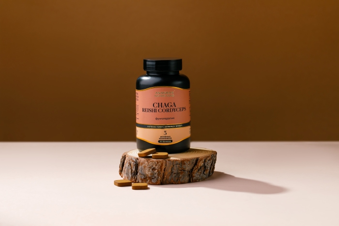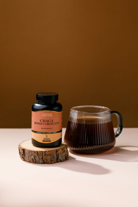 чага гриб, чаги экстракт сухой (густой), корица, мускатный орех, кордицепс экстракт, рейши гриб, компритол (антислеживающий агент), крахмал картофельный (носитель).