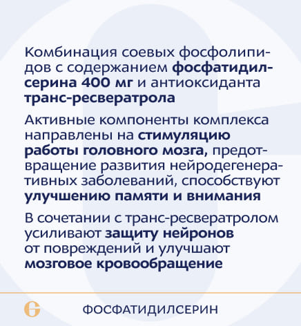 фосфатидилсерин, транс-ресвератрол. Вспомогательные вещества: каприл-каприновые триглицериды (носитель), капсула желатиновая (желатин, глицерин (агент влагоудерживающий)), смесь натуральных токоферолов (антиокислитель), кремния диоксид (агент антислеживающий).