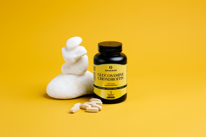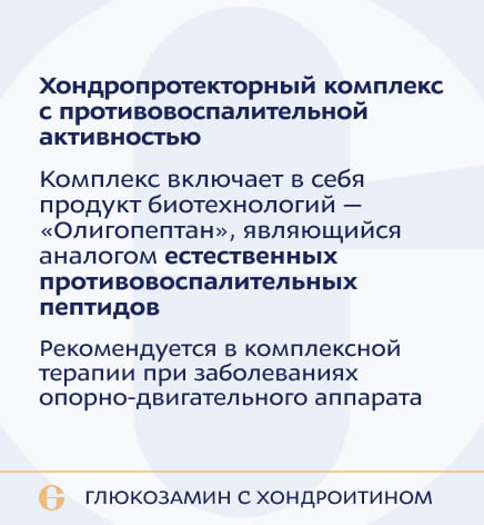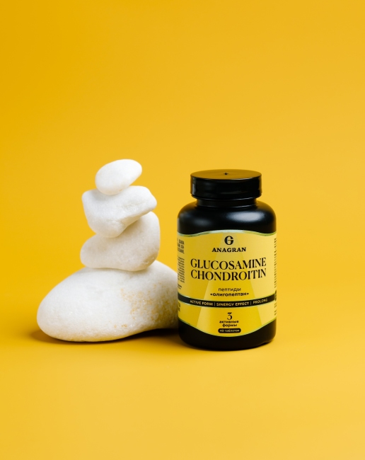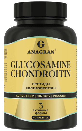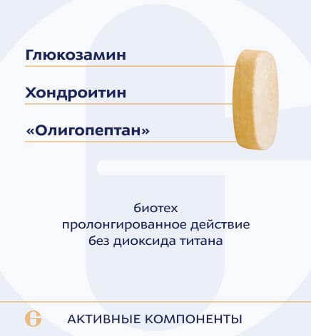 глюкозамин сульфат, хондроитин сульфат, кальция карбонат (носитель), целлюлоза микрокристаллическая (носитель), гидроксипропилметилцеллюлоза (носитель), олигопептан (пептиды, полученные из сывороточного белка методом ферментативного гидролиза протеазой), кремния диоксид (агент антислеживающий), магниевая соль стеариновой кислоты (агент антислеживающий), кроскарамеллоза (носитель), полиэтиленгликоль (носитель), красители: железа оксид желтый, черный, красный.