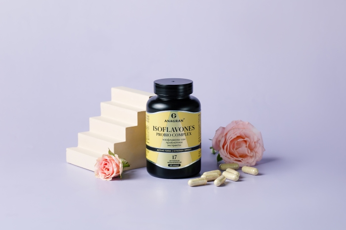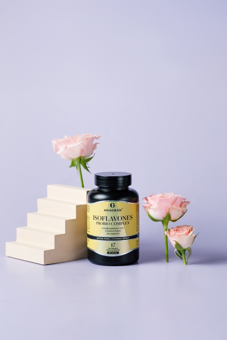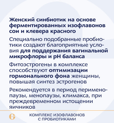 изофлавоны сои, ферментированные консорциумом штаммов (содержит Lactobacillus casei ARTB-114, Lactobacillus fermentum ARTB-205, Bifidobacterium breve ARTB-129, Bifidobacterium breve ARTB-112, Bifidobacterium longum ARTB-113), биомасса бактерий селективная сухая BB-Br серии «Панбиом» («Panbiom»)» (содержит бактерии группы Bifidobacterium breve ARTB-129, Bifidobacterium animalis ARTB-116, Lactobacillus fermentum ARTB-101, Lactobacillus gasseri ARTB-394), клевера красного травы экстракт, изофлавоны сои, 5-гидрокситриптофан, сухая липосомированная субстанция с экстрактом яблони (экстракт яблони, лецитин), витамин С (натрия аскорбат), кверцетин, дудника экстракт, витамин В6 (пиридоксаль-5-фосфат), витамин D3 (холекальциферол), витамин В2 (рибофлавин), витамин В9 (L-метилфолат кальция), витамин В12 (метилкобаламин). Вспомогательные вещества: инулин (носитель), капсула желатиновая (желатин, глицерин (агент влагоудерживающий)), кальция стеарат (агент антислеживающий), кремния диоксид (агент антислеживающий).