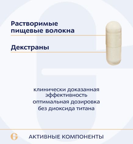 декстраны "КДекс (KDex)". Вспомогательные вещества: микрокристаллическая целлюлоза (носитель), гуммиарабик, капсула желатиновая (желатин, глицерин (агент влагоудерживающий)), кальция стеарат (агент антислёживающий), кремния диоксид (агент антислёживающий).