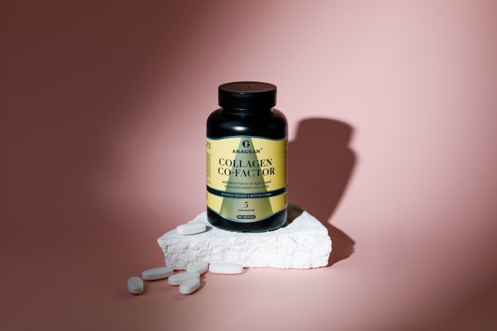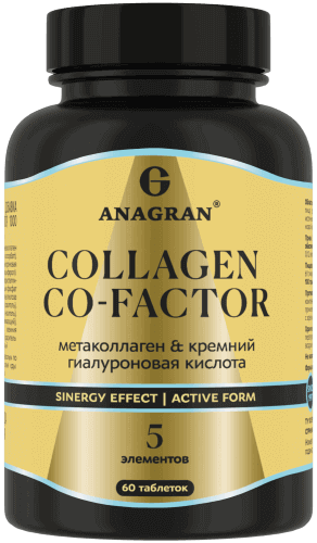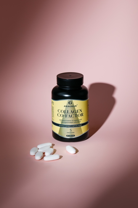 пептиды коллагена (метаколлаген кремний+), витамин С (кальция аскорбат), витамин К2 (менахинон), гиалуроновая кислота, витамин D3 (холекальциферол). Вспомогательные вещества: микрокристаллическая целлюлоза (носитель), кальция фосфат (носитель), гидроксипропилметилцеллюлоза (носитель), карбонат кальция (краситель), натриевая соль кроскармеллозы (носитель), кальция стеарат (агент антислеживающий), полиэтиленгликоль (носитель), кремния диоксид (агент антислеживающий), краситель: железа оксид желтый, черный, красный.