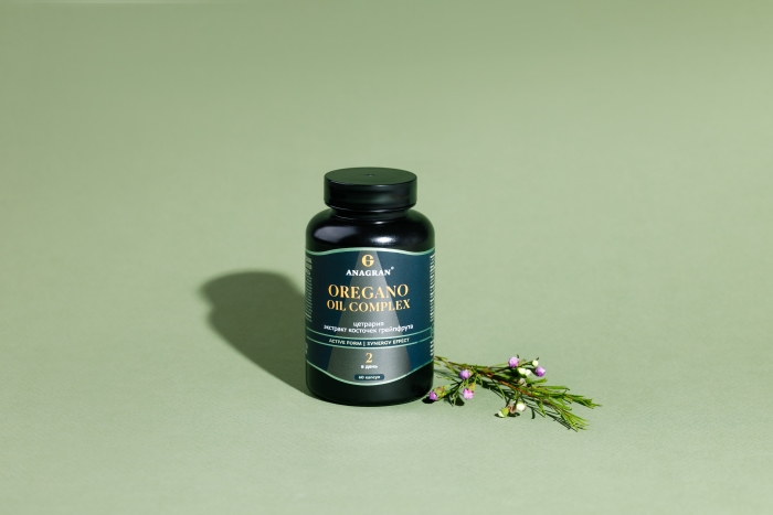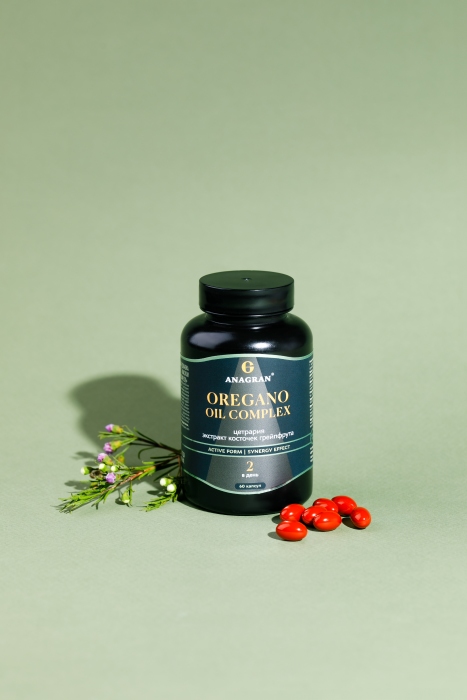 масло орегано, грейпфрута косточек экстракт, цетрарии исландской экстракт. Вспомогательные вещества: капсула желатиновая (желатин, сорбит (агент влагоудерживающий), глицерин (агент влагоудерживающий)), карбоксиметилцеллюлоза натриевая соль (носитель), трикальция фосфат (носитель), поливинилпирролидон (носитель), пропиленгликоль (агент влагоудерживающий), красители: железа оксид красный, черный, желтый, смесь натуральных токоферолов (антиокислитель).