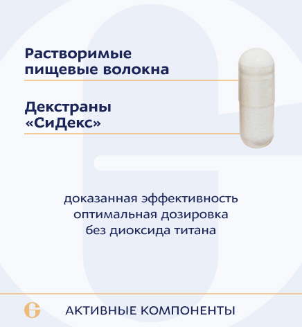 декстраны "СиДекс (СDex)", гуммиарабик. Вспомогательные вещества: микрокристаллическая целлюлоза (носитель), капсула желатиновая (желатин, глицерин (агент влагоудерживающий)), кальция стеарат (агент антислёживающий), кремния диоксид (агент антислёживающий).