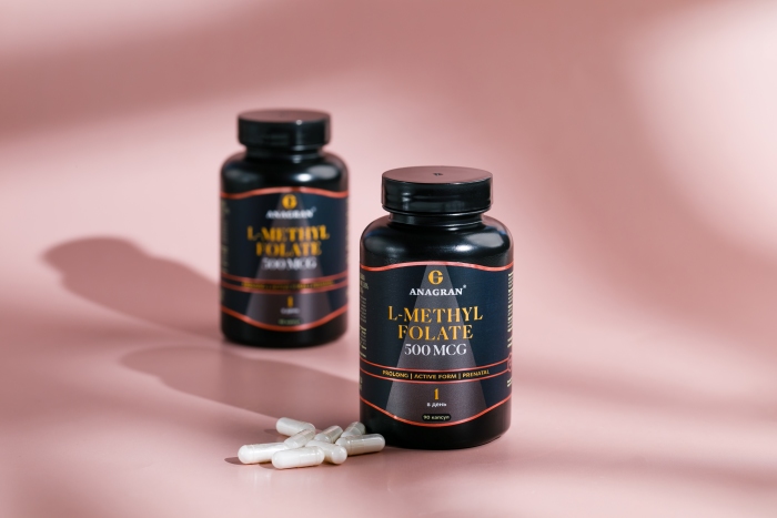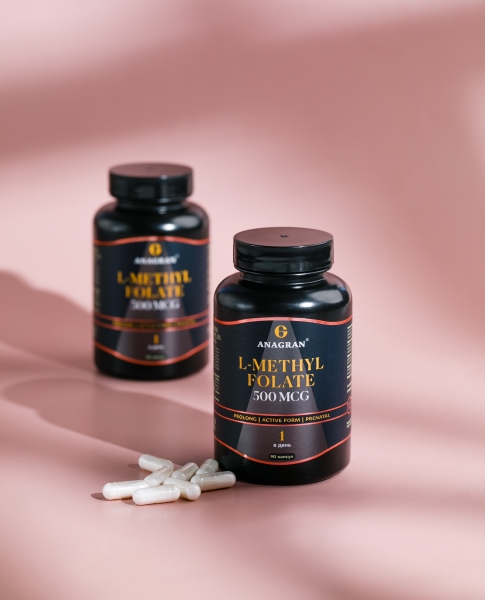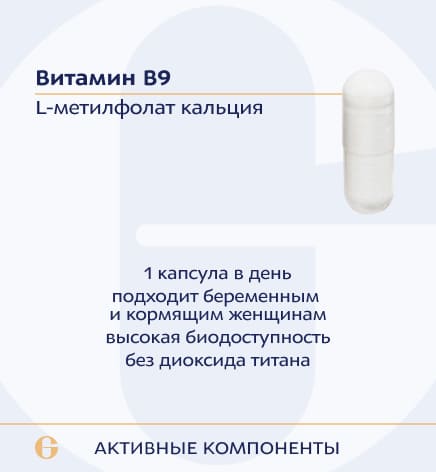 L-метилфолат кальция (витамин В9). Вспомогательные вещества: носители: крахмал картофельный, микрокристаллическая целлюлоза; капсула желатиновая (желатин, глицерин (агент влагоудерживающий)), агенты антислеживающие: магниевая соль стеариновой кислоты, кремния диоксид.