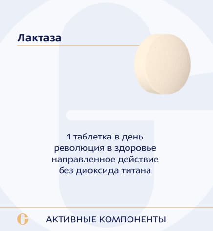 лактаза. Вспомогательные вещества: целлюлоза микрокристаллическая (носитель), кальция карбонат (носитель), гидроксипропилметилцеллюлоза (носитель), поливинилпирролидон (носитель), кремния диоксид (агент антислеживающий), полиэтиленгликоль (носитель), кальциевая соль стеариновой кислоты (агент антислеживающий), железа оксид желтый (краситель), железа оксид красный (краситель).