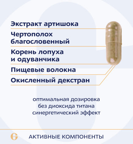 артишока листа экстракт, инулин, володушки золотистой трава, лопуха корня экстракт, одуванчика корня экстракт, чертополоха благословенного трава, декстран. Вспомогательные вещества: капсула разъемная твердая желатиновая (желатин, глицерин (агент влагоудерживающий)), кальция стеарат (агент антислеживающий), кремния диоксид (агент антислеживающий).