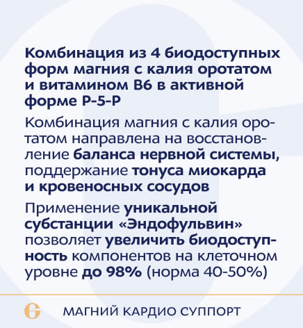 магния таурат, магния цитрат, калия оротат, магния оротат, аквамин магния, витамин В6 (пиридоксина гидрохлорид /пиридоксаль-5-фосфат), комплекс «Эндофульвин». Вспомогательные вещества: изомальтит (носитель), лимонная кислота (регулятор кислотности).