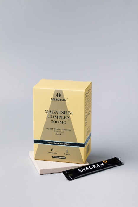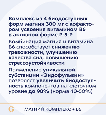 Магния малат, магния лактат, магния треонат, аквамин магния, витамин В6 (пиридоксаль-5-фосфат), комплекс «Эндофульвин». Вспомогательные вещества: изомальтит (носитель), лимонная кислота (регулятор кислотности).