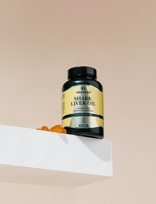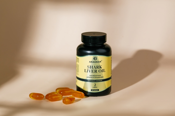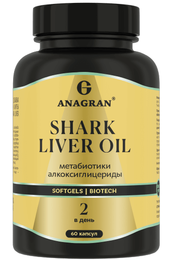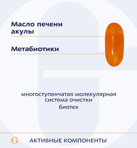 масло печени акулы (Icelandic Shark Liver Oil), Ультрализаты пептидные: Bifidobacterium longum ARTB-184, Lactobacillus salivarius ARTB-142, Lactobacillus rhamnosus ARTB-183, Lactobacillus acidophilus ARTB-177. Вспомогательные вещества: капсула желатиновая (желатин (носитель), глицерин (агент влагоудерживающий)), кремния диоксид (антислеживающий агент), гриндокс 539 (антиокислитель).