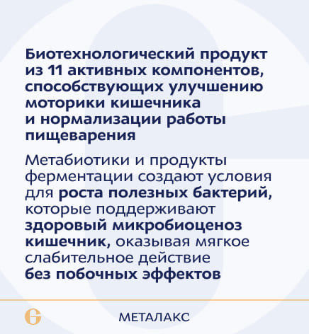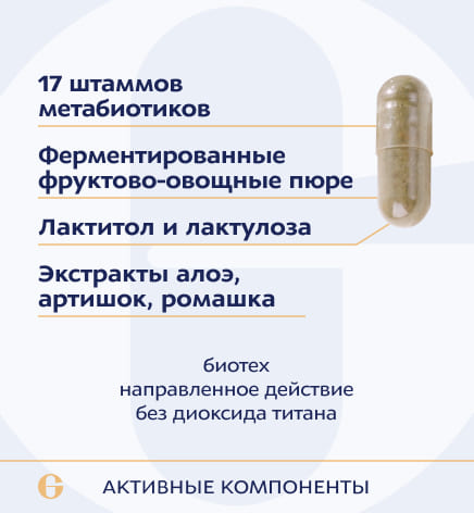 лактитол, алоэ вера экстракт сухой, панкреатин, артишока листа экстракт, лактулоза, комплексная пищевая добавка «Метафул» (комбуча концентрат, биомасса гидролизованная «УЛЬТРАЛИЗАТ ПЕПТИДНЫЙ»: BB-Bf Bifidobacterium bifidum (ARTB-187), BB-Ad Bifidobacterium adolescentis (ARTB-127), BB-An Bifidobacterium animalis (ARTB-128), BB-Ln Bifidobacterium longum (ARTB-184), BB-Br Bifidobacterium breve (ARTB-129), BB-If Bifidobacterium infantis (ARTB-189), LB-Ac Lactobacillus acidophilus (ARTB-130), LB-Ac Lactobacillus acidophilus (ARTB-177), LB-Pl Lactobacillus plantarum (ARTB-135), LB-Pl Lactobacillus plantarum (ARTB-175),LB-Bg Lactobacillus delbrueckii subsp.bulgaricus (ARTB-131), LB-Sl Lactobacillus salivarius (ARTB-136), LB-Sl Lactobacillus salivarius (ARTB-142), LB-Rm Lactobacillus rhamnosus (ARTB-183), LB-Rm Lactobacillus rhamnosus (ARTB-180), LB-Hl Lactobacillus helveticus (ARTB-133), LB-Hl Lactobacillus helveticus (ARTB-174), гуммиарабик, молочная кислота, гуаровая камедь, ксантановая камедь), экстракт цветков ромашки, концентраты плодовоовощные биоферментированные лизированные: тыквенный, яблочный, кабачковый, Вспомогательные вещества: капсула желатиновая (желатин, глицерин (агент влагоудерживающий)), арабиногалактан (носитель), кальциевая соль стеариновой кислоты (агент антислеживающий), кремния диоксид аморфный (агент антислеживающий).