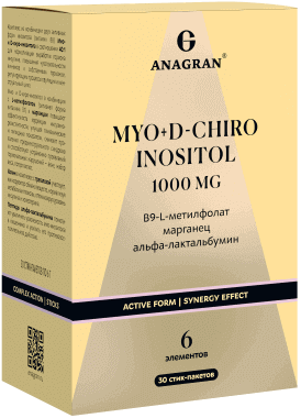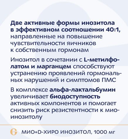 инозитол (мио-инозитол), D-хиро-инозитол, холина битартрат, сывороточного альфа-лактальбумина гидролизат «Альбутин Альфа (Albutin Alpha)» (творог альбуминный, кальция карбонат, концентрат смеси токоферолов (антиокислитель)), марганца L-аспартат, витамин В9 (L-метилфолат кальция). Вспомогательные вещества: трегалоза (носитель), ароматизатор натуральный манго+кокос, кремния диоксид (агент антислёживающий), сукралоза (подсластитель).