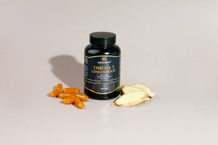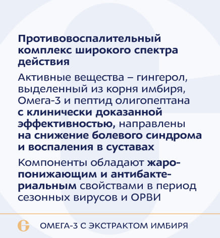 рыбный жир, имбиря корня экстракт, олигопептан (концентрат сывороточного белка), босвелии экстракт, ивы коры экстракт. Вспомогательные вещества: капсула желатиновая (желатин, глицерин (агент влагоудерживающий)), кремния диоксид (агент антислеживающий), смесь натуральных токоферолов (антиокислитель)