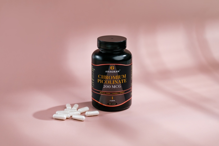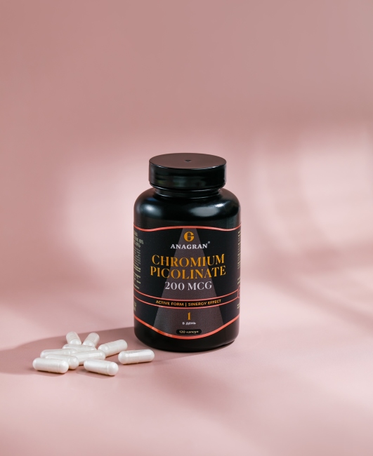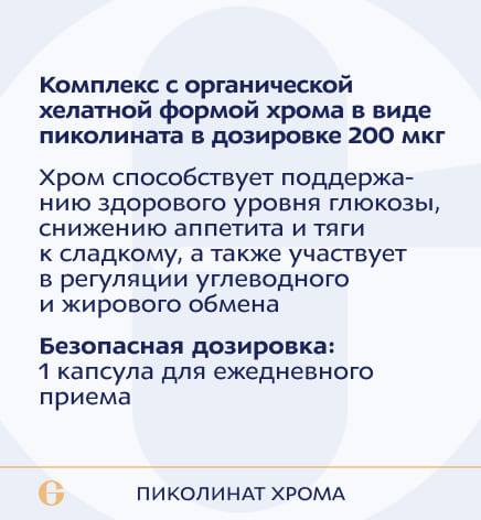 хрома пиколинат. Вспомогательные вещества: носитель: крахмал картофельный микрокристаллическая целлюлоза, капсула желатиновая (желатин, глицерин (агент влагоудерживающий)), агенты антислеживающие: магниевая соль стеариновой кислоты, кремния диоксид.
